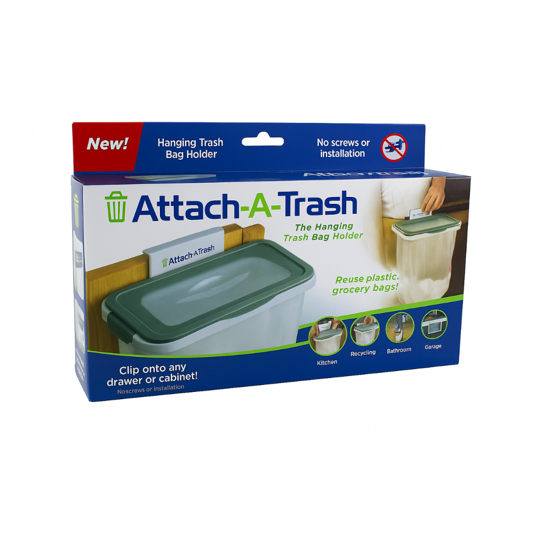Contenido de la caja • 1 Porta Bolsa de Basura Attach A Trash • Color: Blanco • Tipo de empaque: Caja reutilizable y fácil de abrir • No incluye bolsas