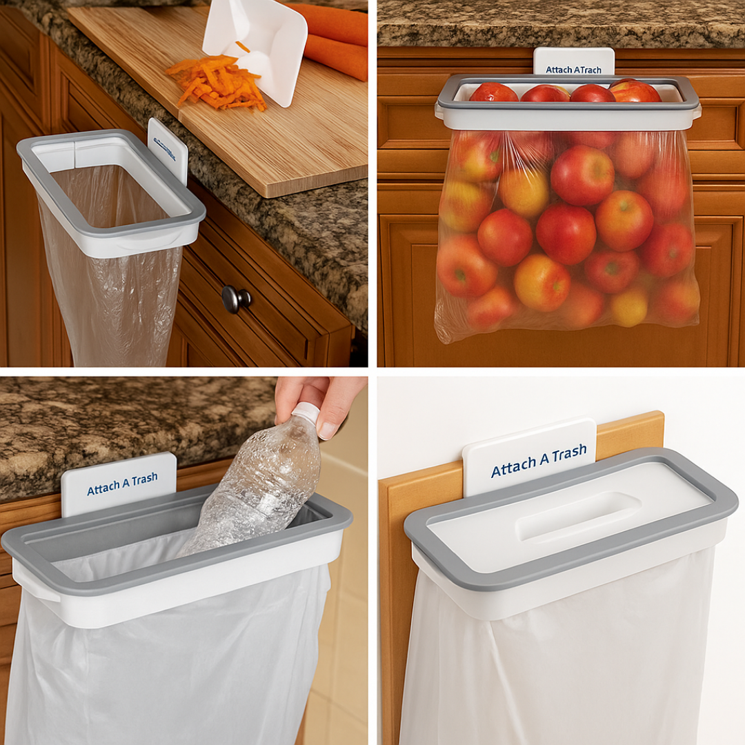 Destacado del producto • Práctico: Colócalo fácilmente en cualquier borde de mueble o puerta. • Creativo: Diseñado para aprovechar el espacio que normalmente no se usa. • Sencillo: No requiere instalación ni herramientas. • Higiénico: Evita el contacto directo con la basura. • Ahorra espacio: Ideal para departamentos, oficinas o casas pequeñas.